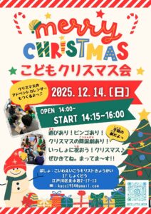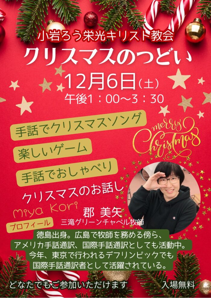 小岩ろう栄光キリスト教会 クリスマスのつどい 2025年12月6日 最終更新日時 : 2025年12月6日 office 12月6日(土) 午後1:00~3:30手話でクリスマスソング 楽しいゲーム 手話でおしゃべりクリスマスのお話し:郡 美矢(三滝グリーンチャペル牧師)入場無料 どなたでもご参加いただけます